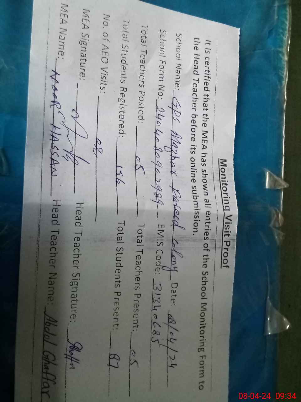 | EMIS Code: 31340685 | Name of School: GPS MAZHAR FARID COLONY | |||