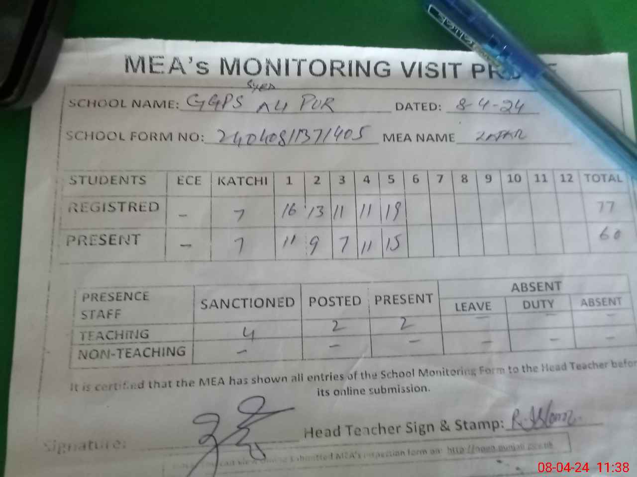 | Attendance Register | Head Teacher | MEA with School | Visit Proof |