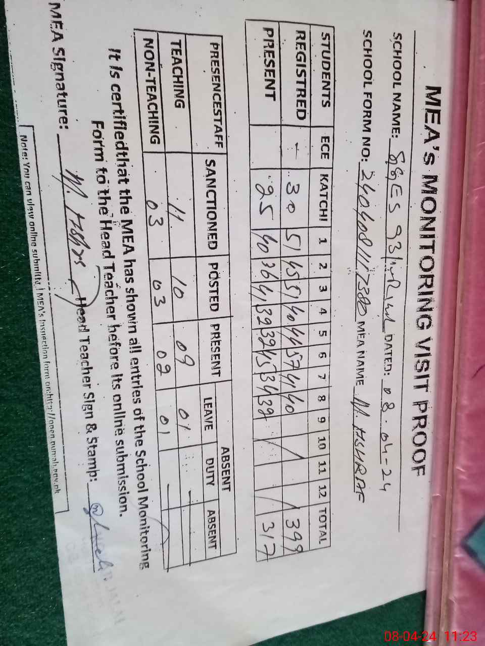 | Attendance Register | Head Teacher | MEA with School | Visit Proof |