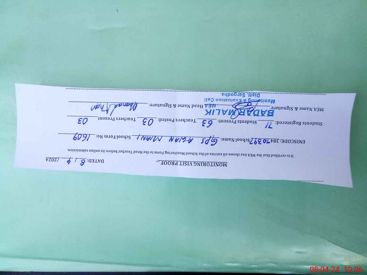 | Attendance Register | Head Teacher | MEA with School | Visit Proof |