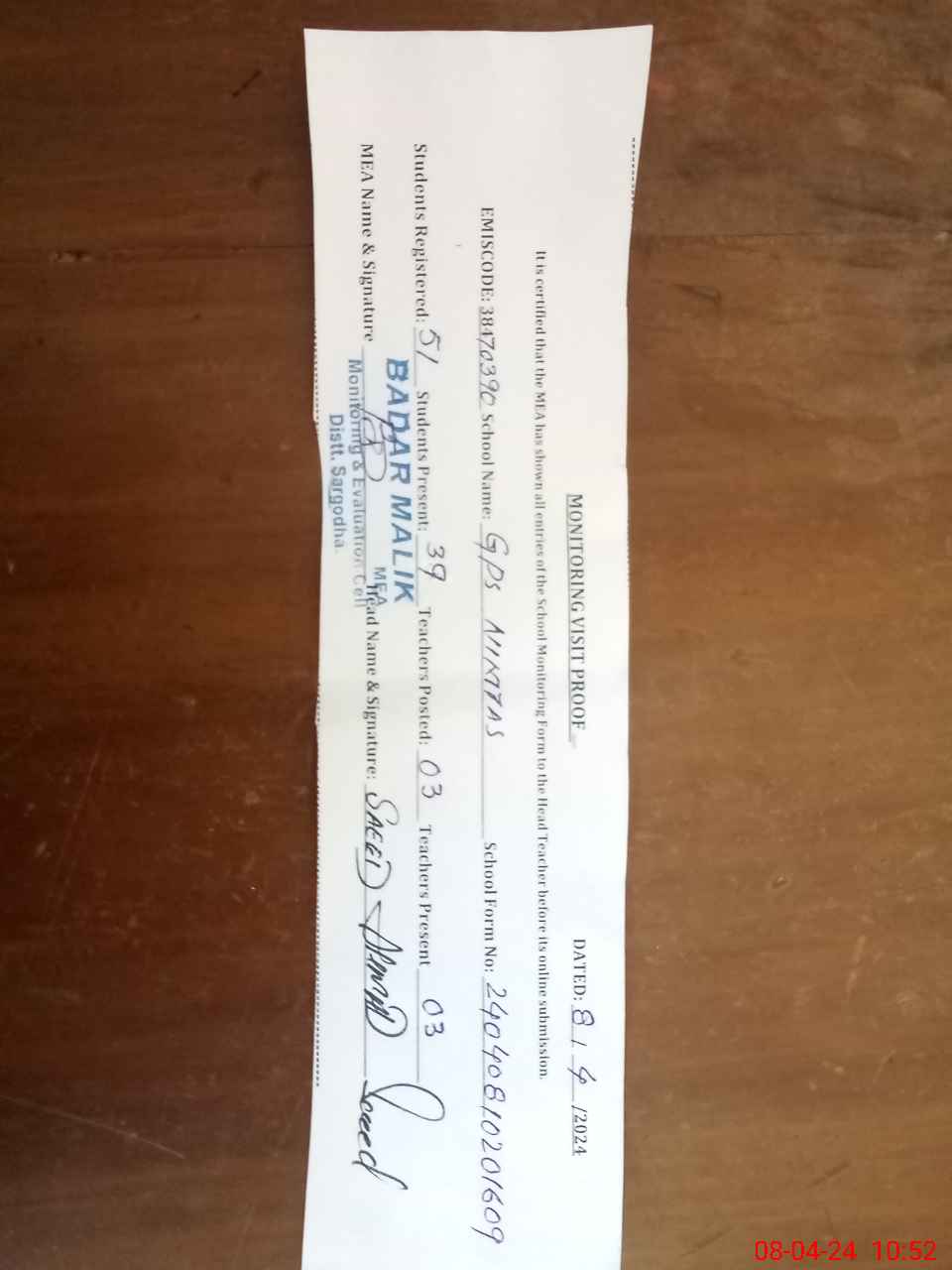 | Monitoring Date: 08-04-2024 | Start Time: 08-04-2024 10:20 AM | End Time: 08-04-2024 10:52 AM | Name of MEA: BA**** MU**** | |