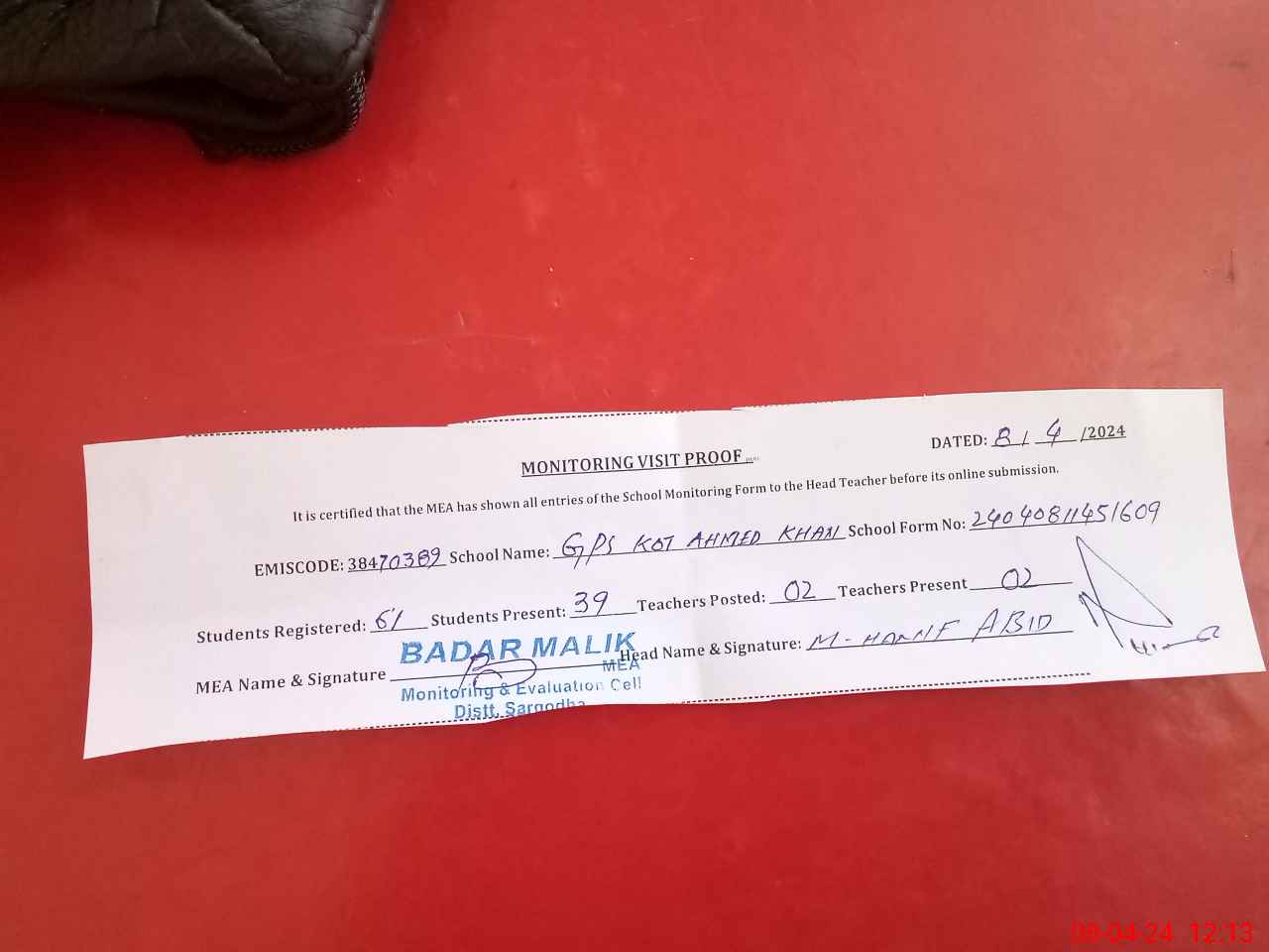 | EMIS Code: 38470389 | Name of School: GPS KOT AHMAD KHAN | |||