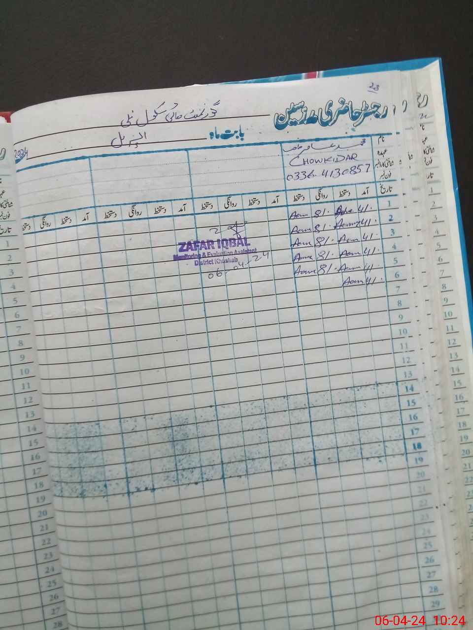 | CNIC | Full Name | Designation | R/C | Absence During Last Calender Month |