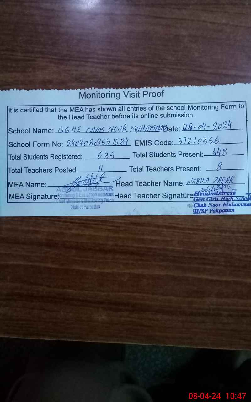 | EMIS Code: 39210356 | Name of School: GGHS CHAK NOOR MUHAMMAD 11/SP | |||