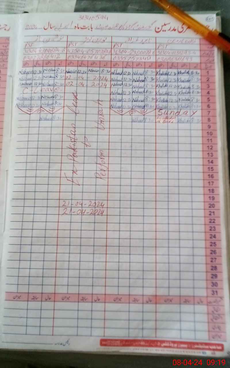 | CNIC | Full Name | Designation | R/C | Absence During Last Calender Month |