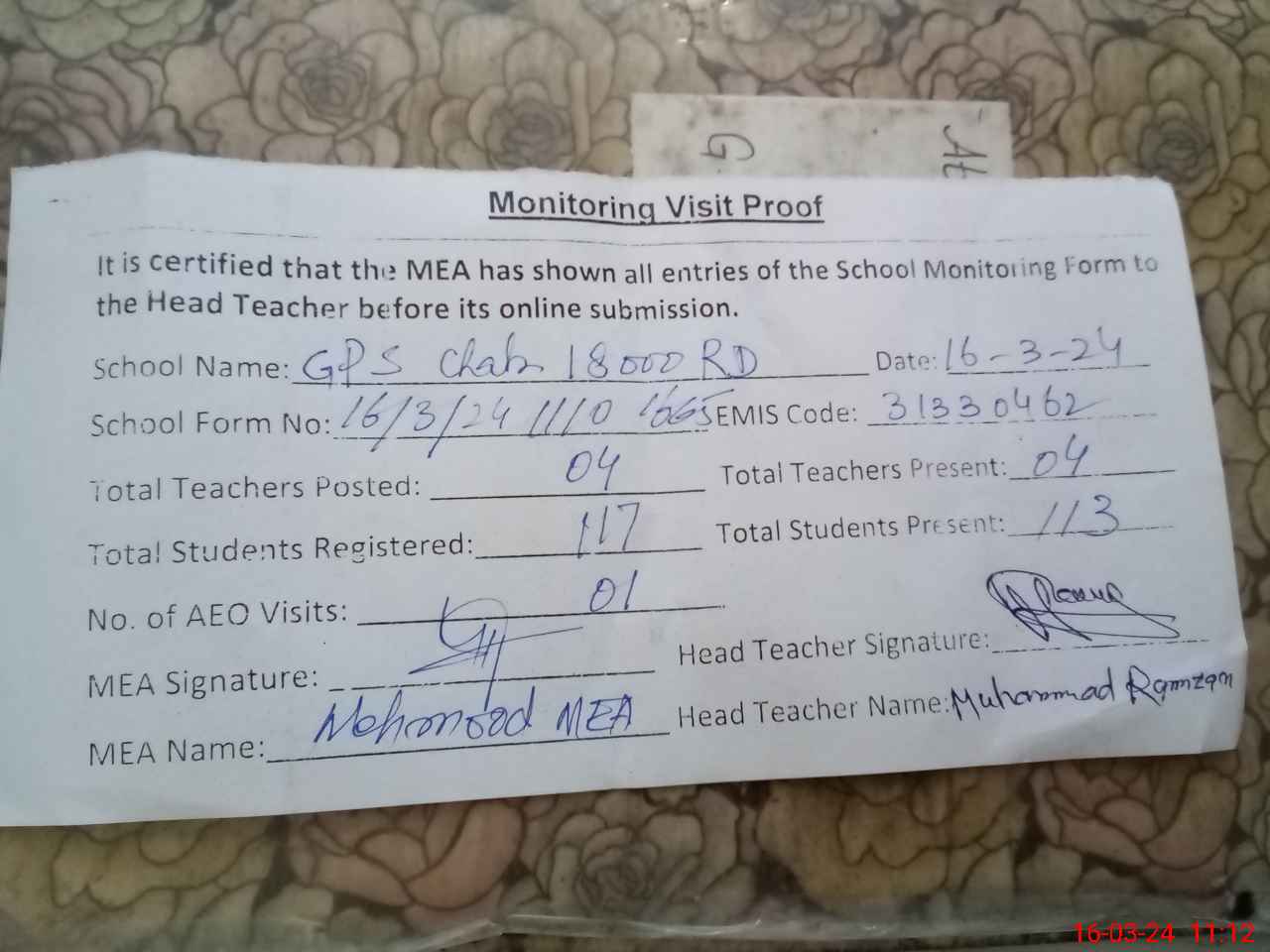 | EMIS Code: 31330462 | Name of School: GPS CHAK NO.18000/RD | |||