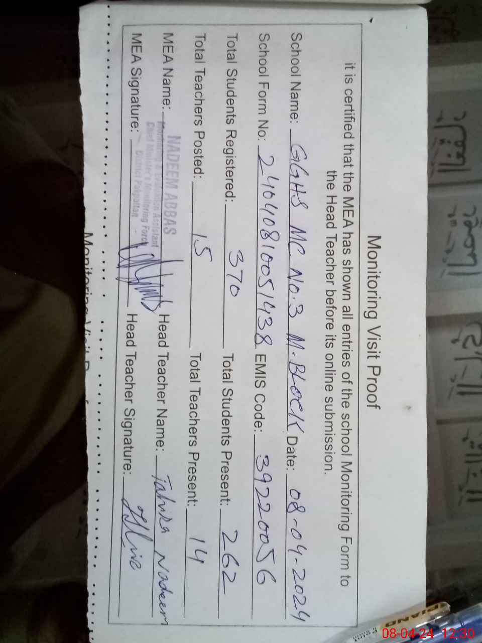 | EMIS Code: 39220056 | Name of School: GGHS MC NO.3 M BLOCK ARIFWALA | |||