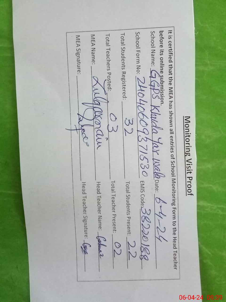| EMIS Code: 38220188 | Name of School: GGPS KHUDA YAR WALA | |||