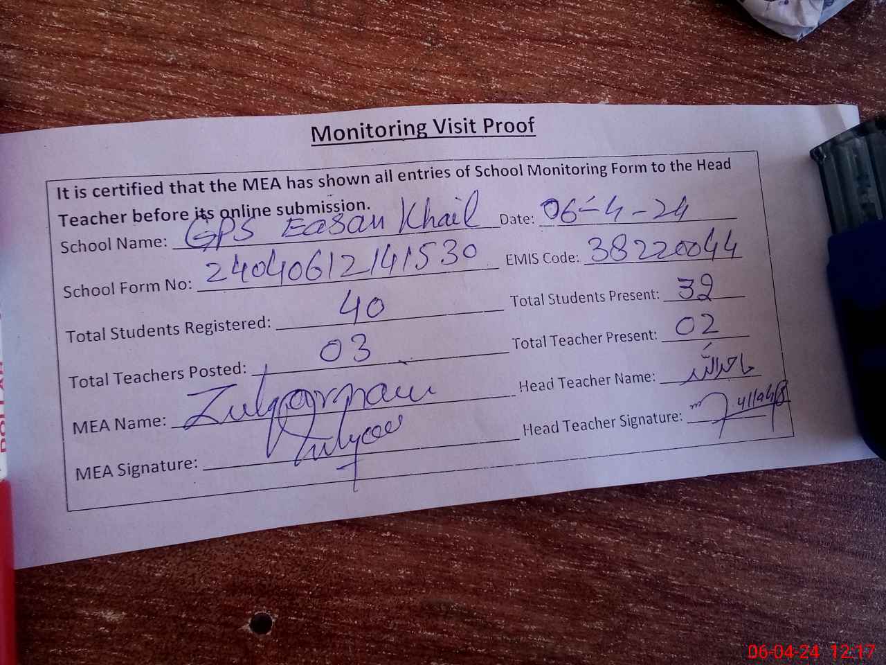 | EMIS Code: 38220044 | Name of School: GPS EASAN KHAIL | |||