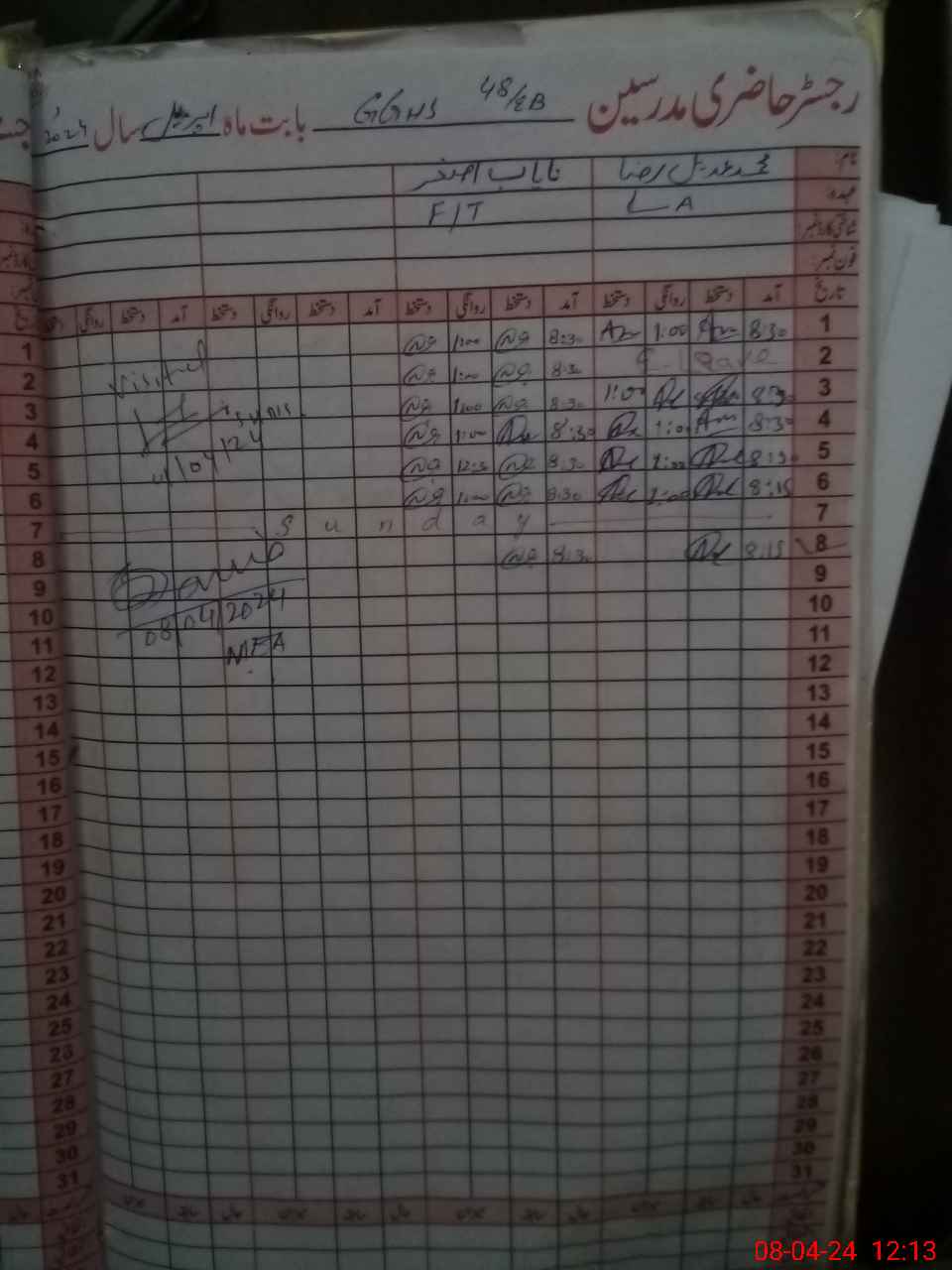| CNIC | Full Name | Designation | R/C | Absence During Last Calender Month |