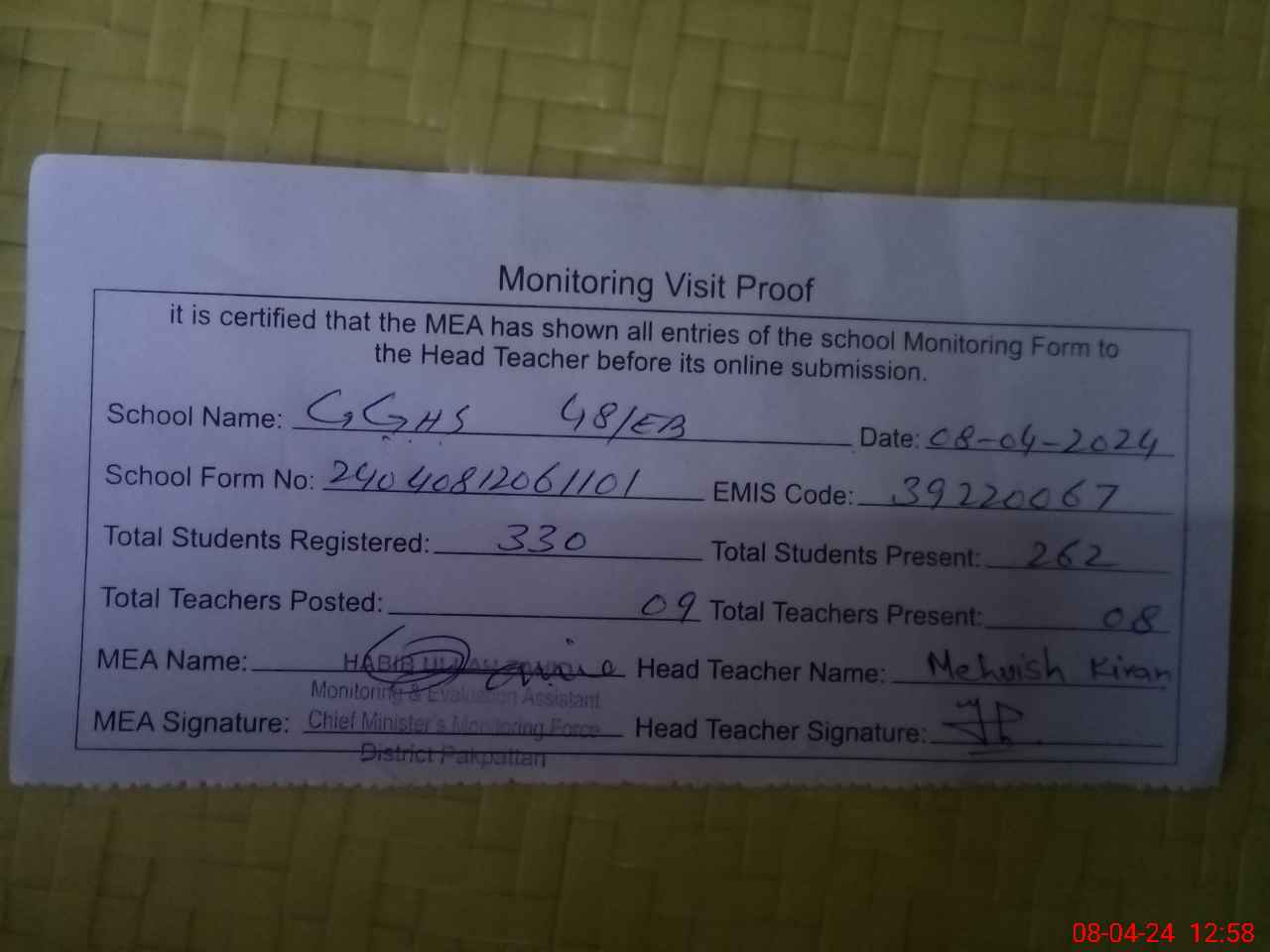 | Monitoring Date: 08-04-2024 | Start Time: 08-04-2024 12:11 PM | End Time: 08-04-2024 12:58 PM | Name of MEA: Ha**** Ul**** Ur**** Ba**** Al**** | |