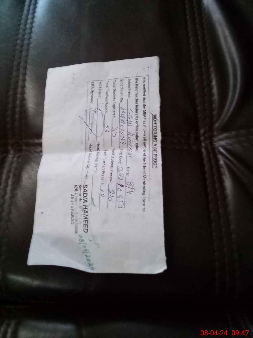 | Certified that this School was Inspected by the Undersigned MEA/DMO Today and the Information Stated Above is as Per Record. | |||||