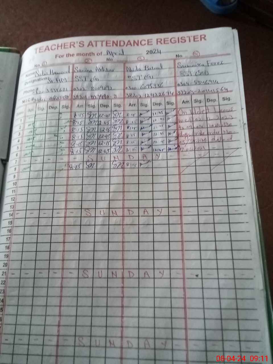 | CNIC | Full Name | Designation | R/C | Absence During Last Calender Month |