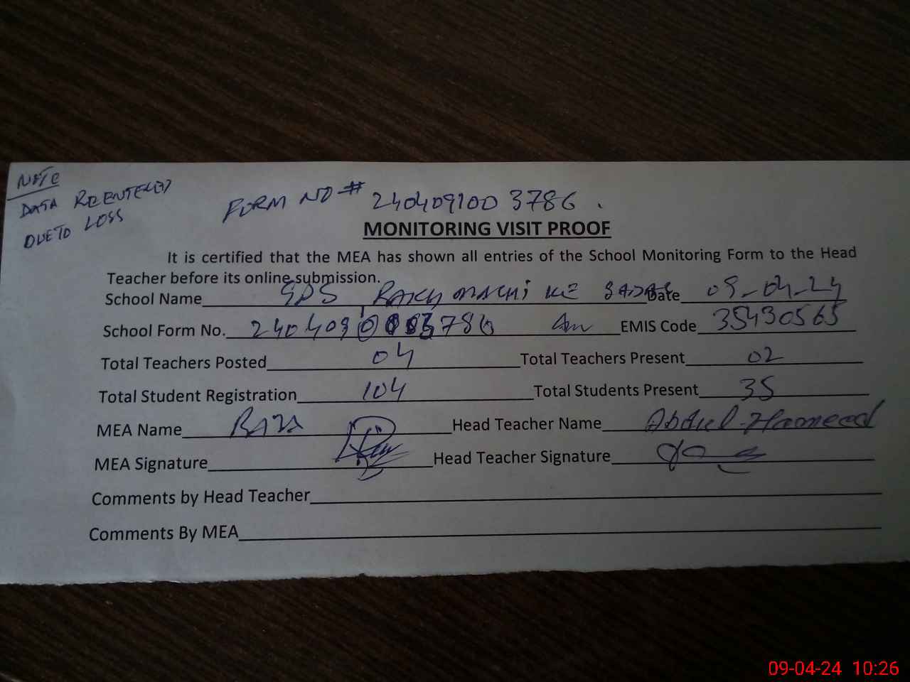 | Certified that this School was Inspected by the Undersigned MEA/DMO Today and the Information Stated Above is as Per Record. | |||||