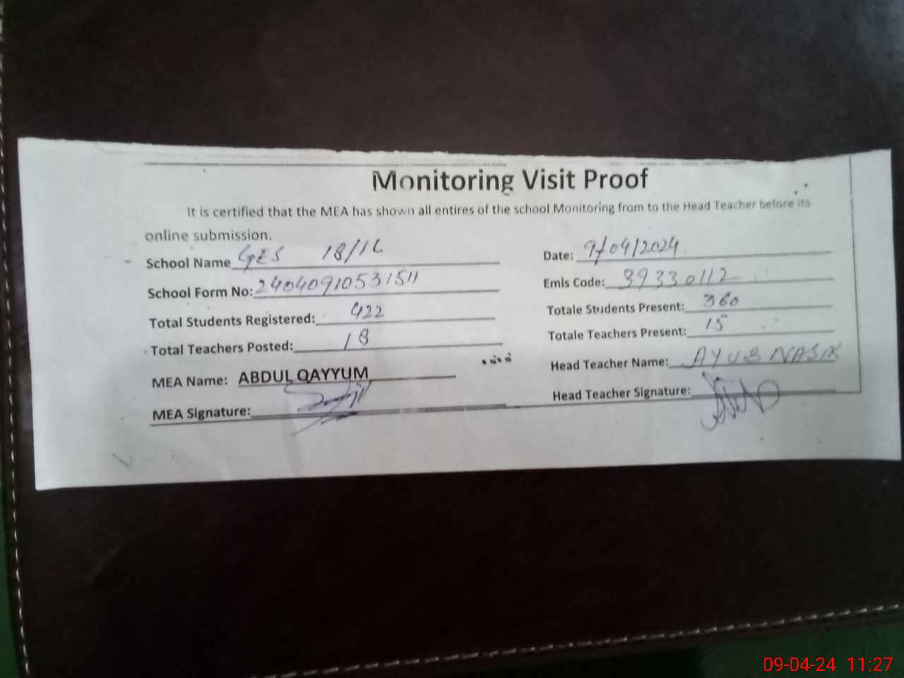 | Attendance Register | Head Teacher | MEA with School | Visit Proof |
