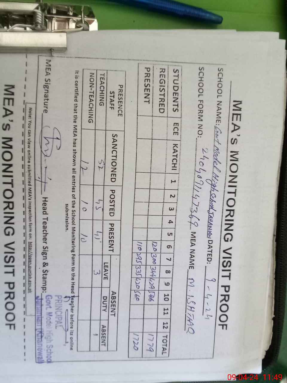 | Attendance Register | Head Teacher | MEA with School | Visit Proof |