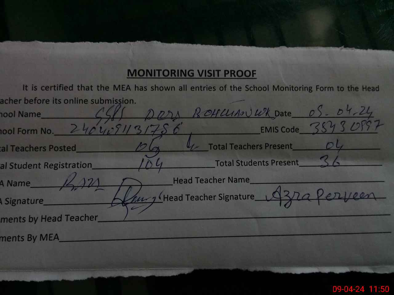 | Attendance Register | Head Teacher | MEA with School | Visit Proof |