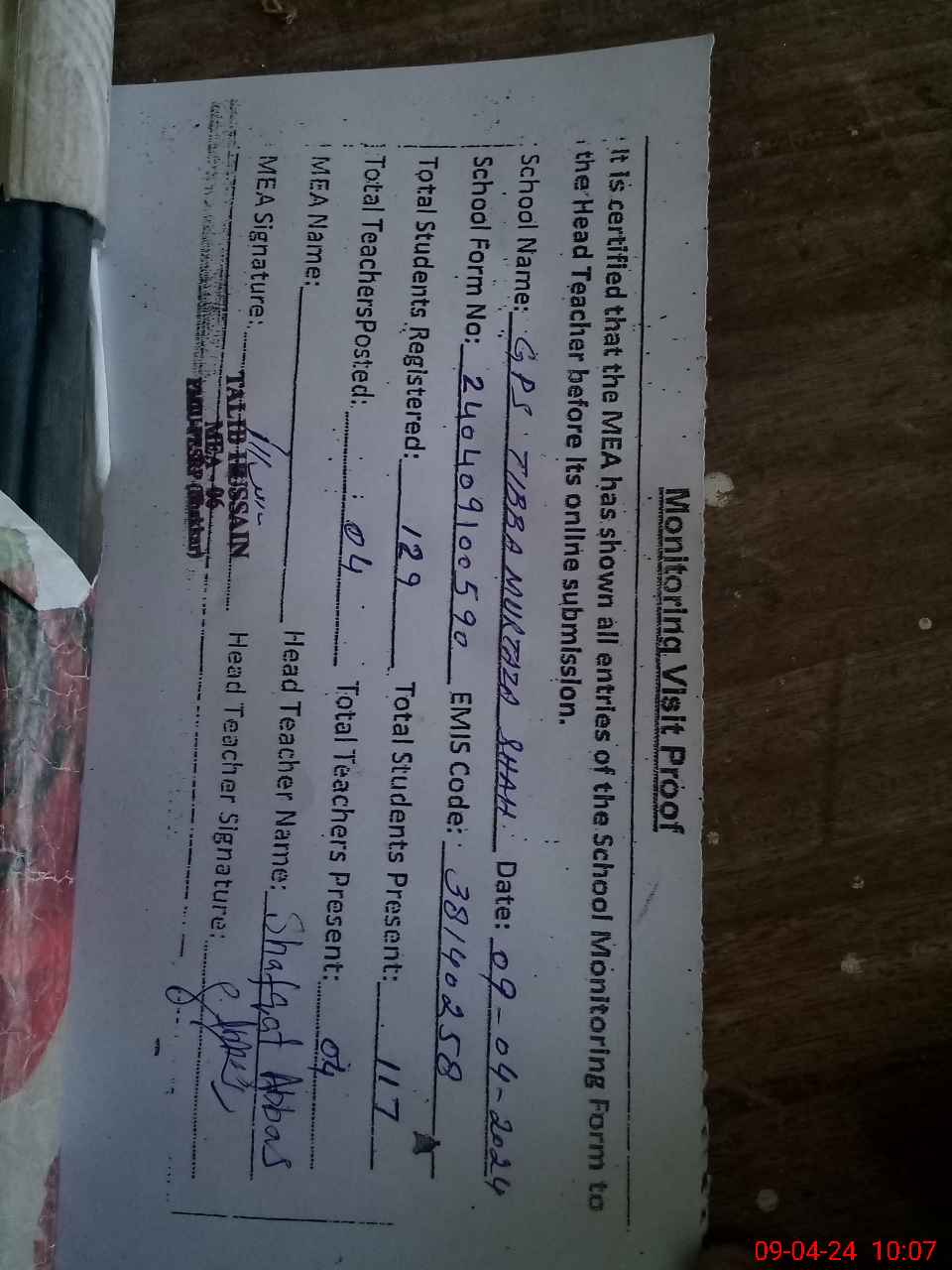 | Attendance Register | Head Teacher | MEA with School | Visit Proof |