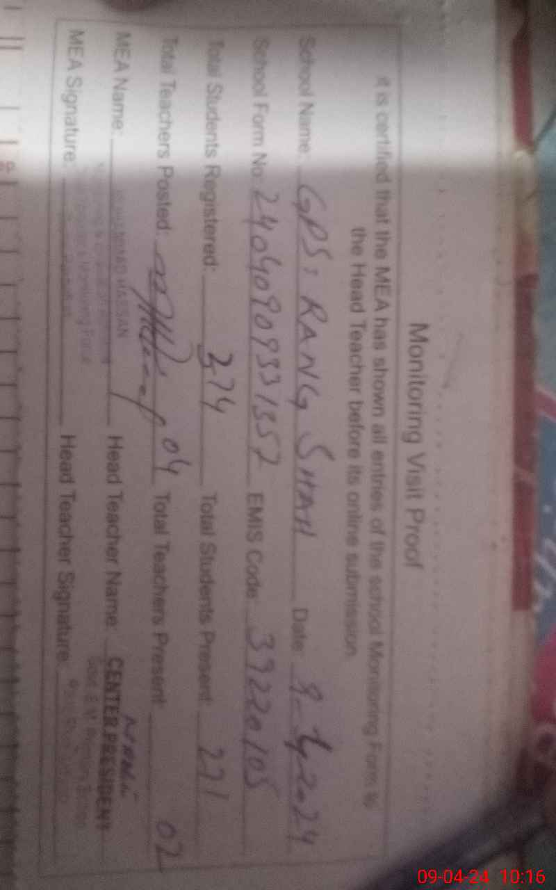 | EMIS Code: 39220105 | Name of School: GPS RANG SHAH | |||