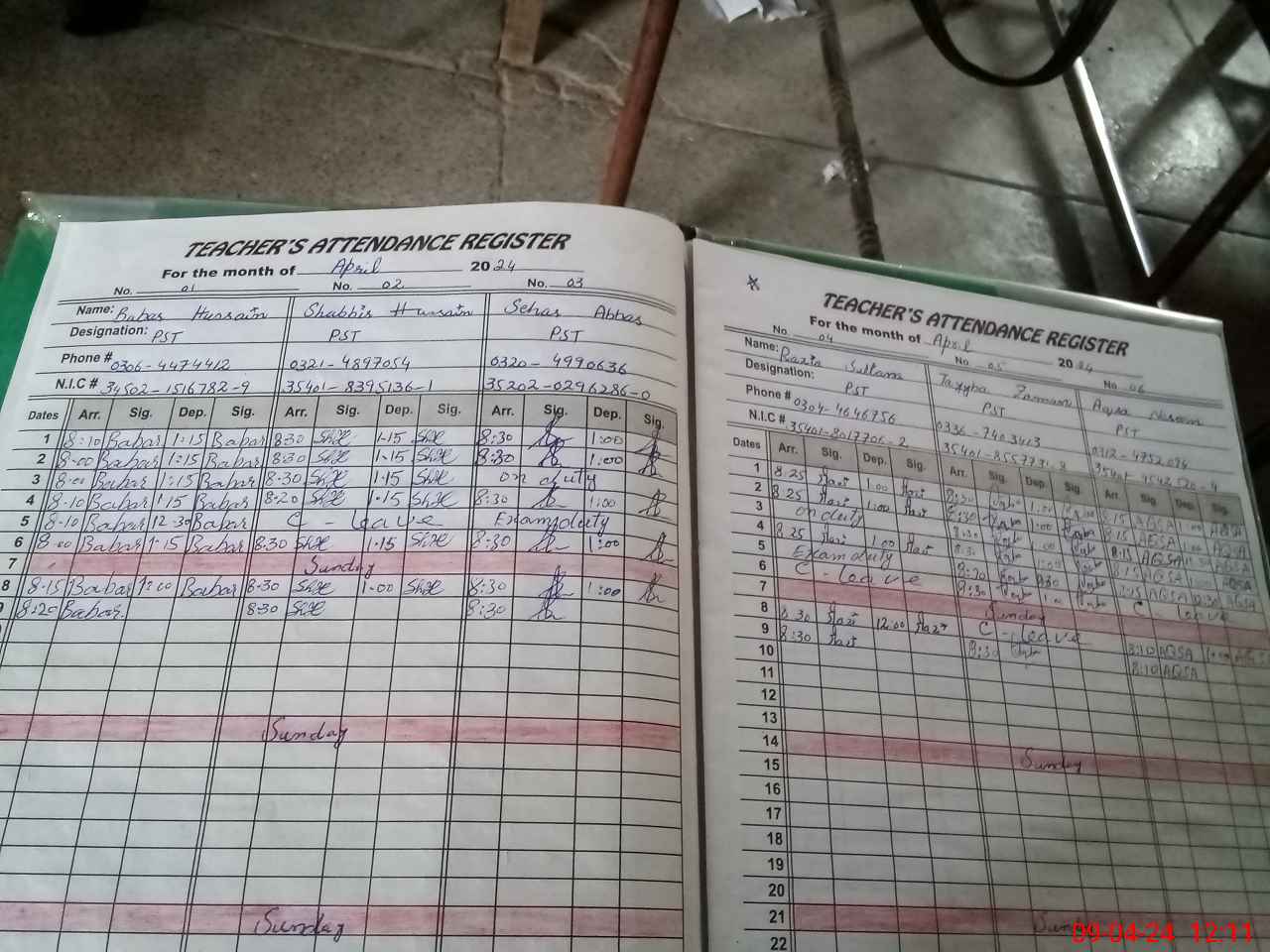 | CNIC | Full Name | Designation | R/C | Absence During Last Calender Month |