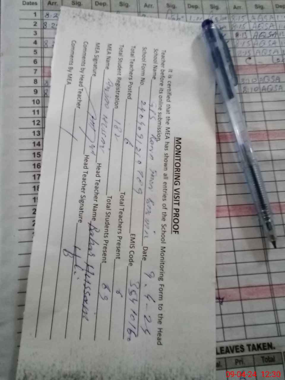 | Attendance Register | Head Teacher | MEA with School | Visit Proof |