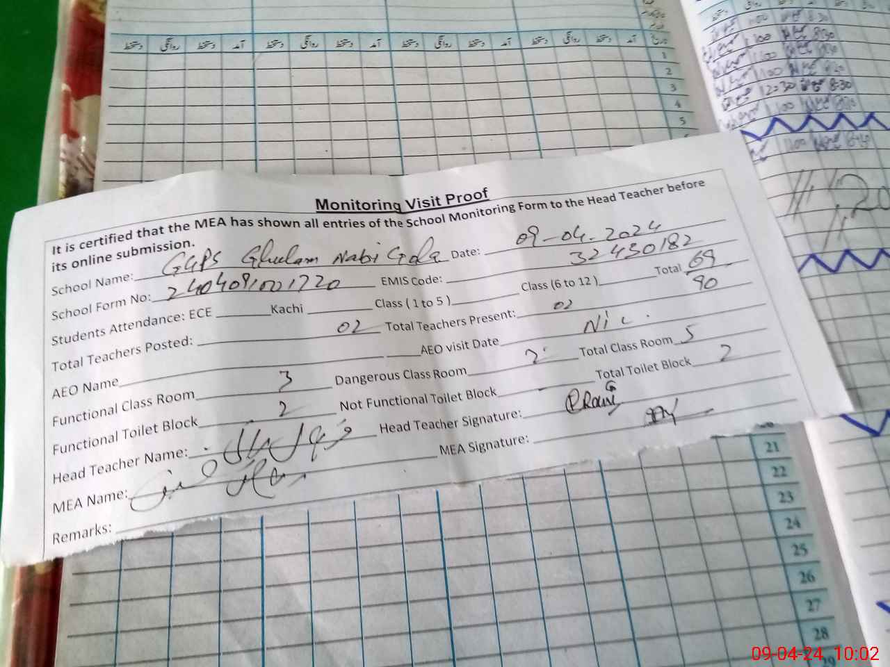 | Attendance Register | Head Teacher | MEA with School | Visit Proof |
