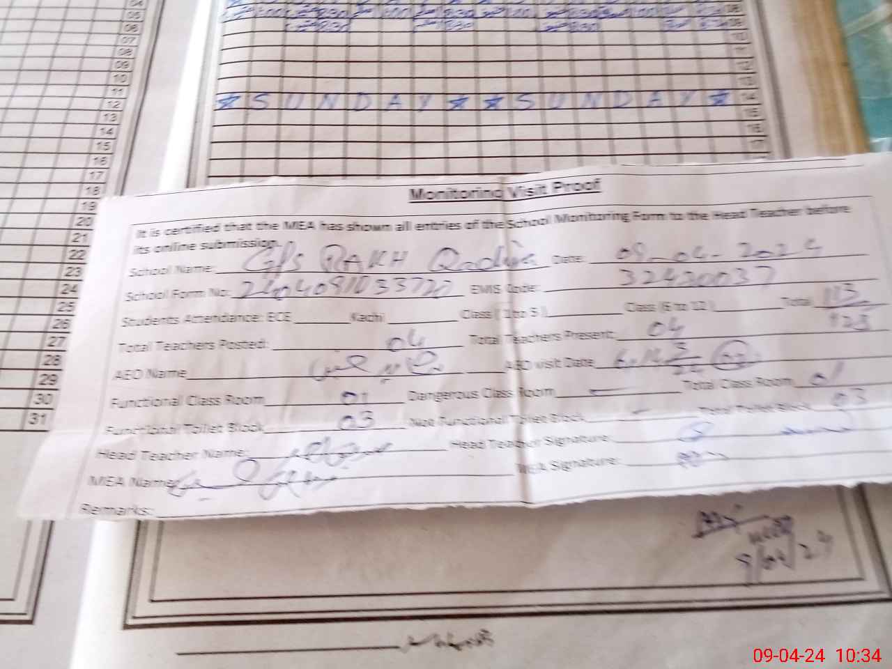 | Attendance Register | Head Teacher | MEA with School | Visit Proof |