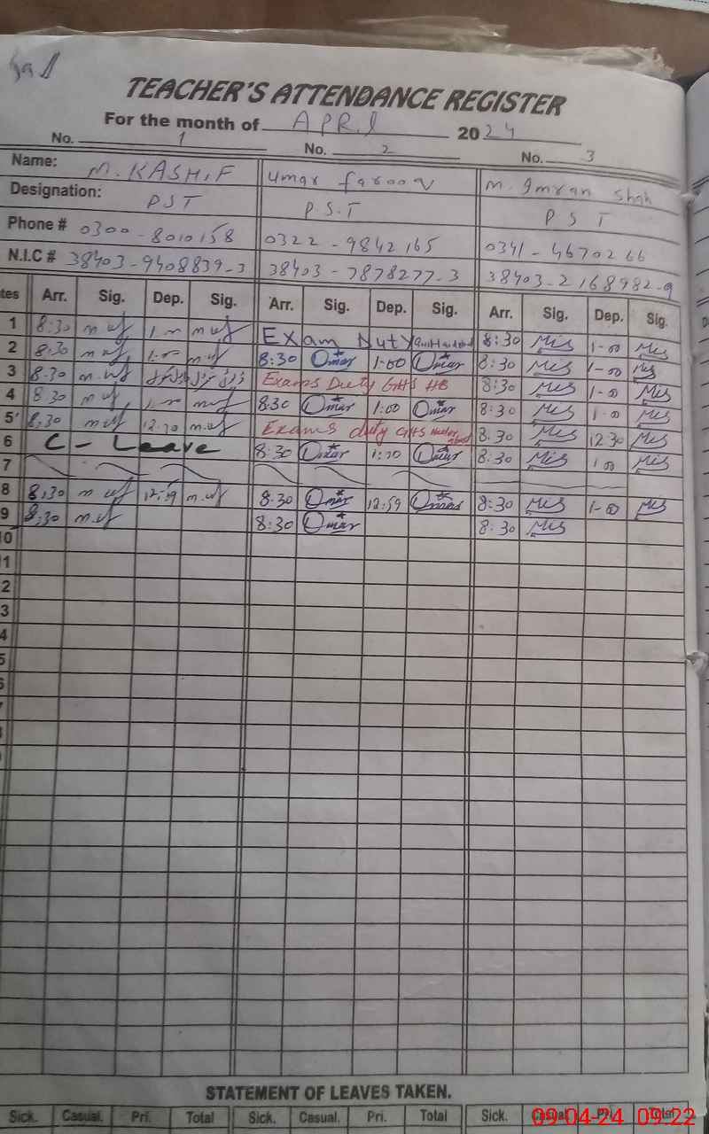 | CNIC | Full Name | Designation | R/C | Absence During Last Calender Month |