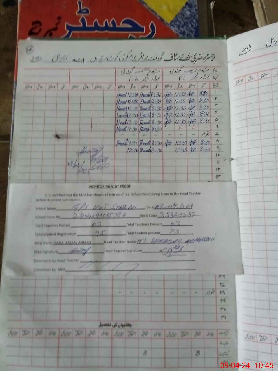 | Attendance Register | Head Teacher | MEA with School | Visit Proof |