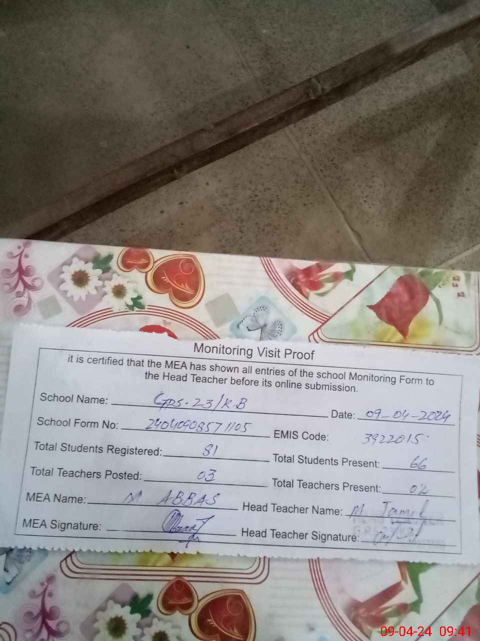 | Attendance Register | Head Teacher | MEA with School | Visit Proof |