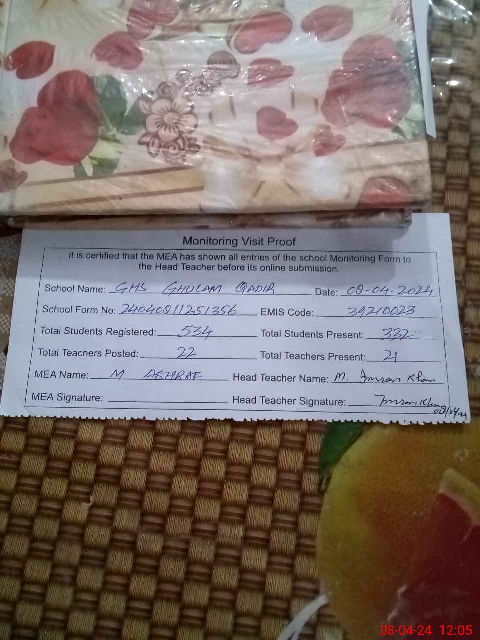 | EMIS Code: 39210023 | Name of School: GHS GHULAM QADIR | |||