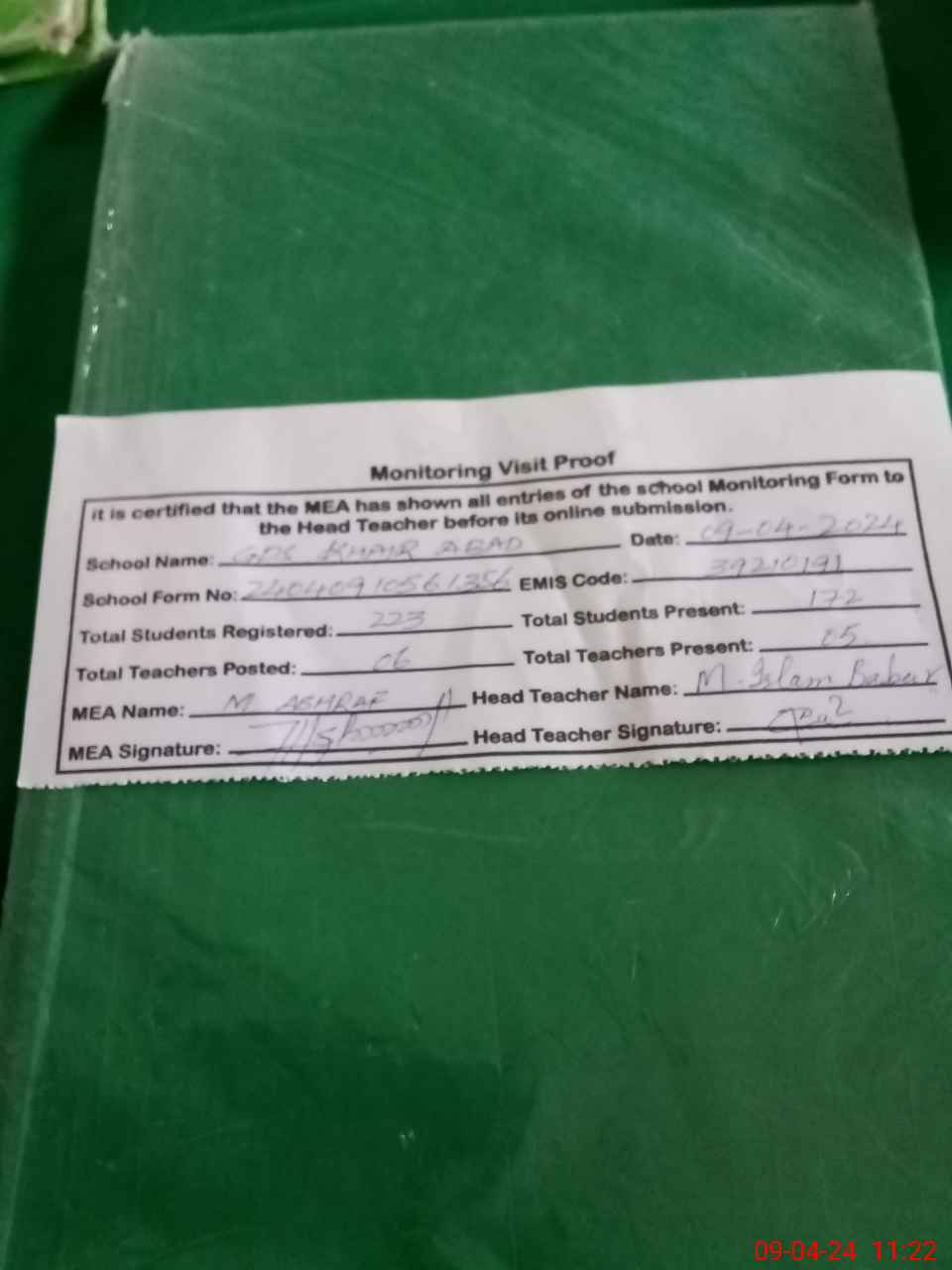 | Attendance Register | Head Teacher | MEA with School | Visit Proof |