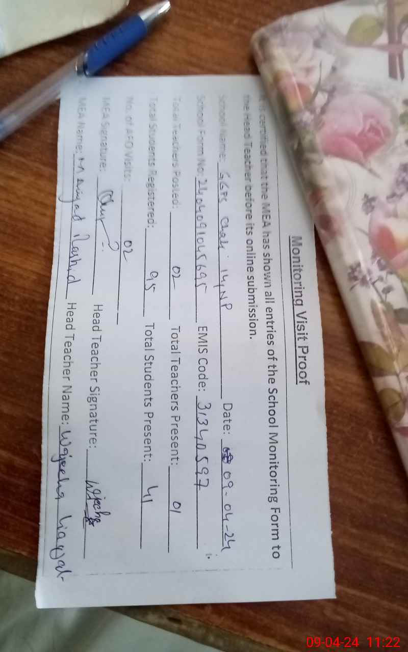| Attendance Register | Head Teacher | MEA with School | Visit Proof |