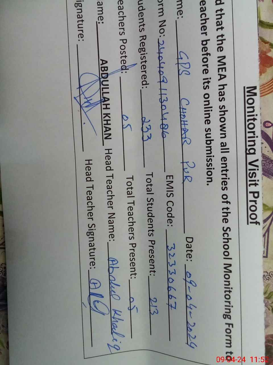 | EMIS Code: 32330667 | Name of School: GPS CHOHAR PUR | |||