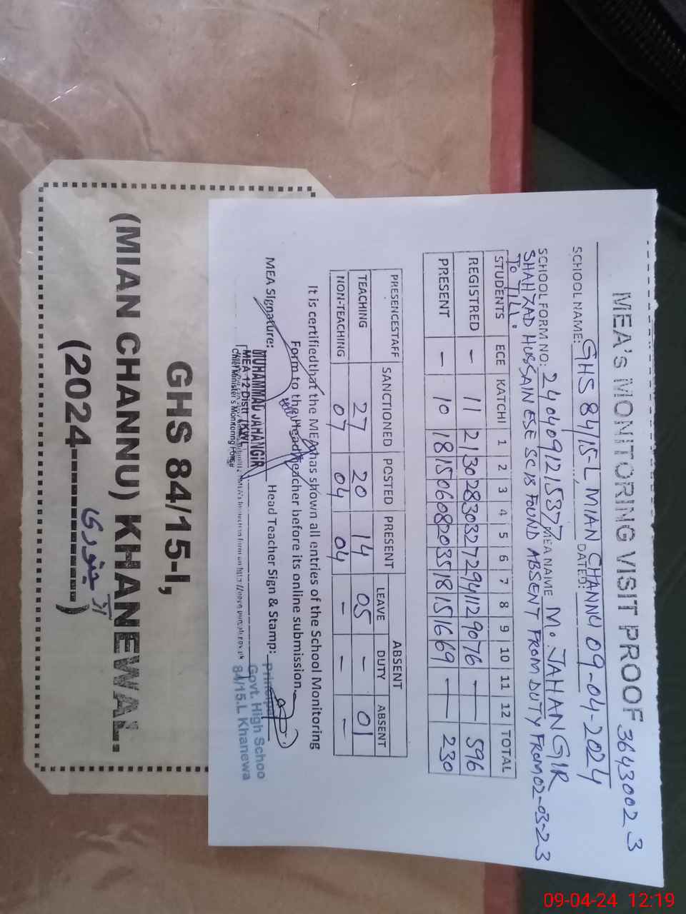 | EMIS Code: 36430023 | Name of School: GHS 84/15-L, MIAN CHANNU | |||