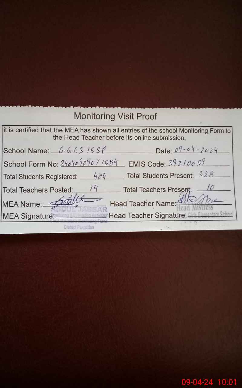 | Certified that this School was Inspected by the Undersigned MEA/DMO Today and the Information Stated Above is as Per Record. | |||||