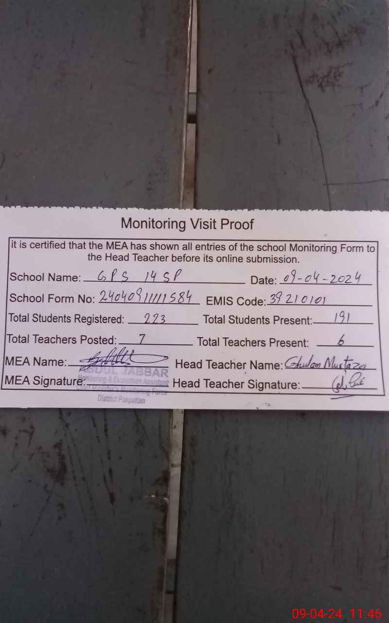 | EMIS Code: 39210101 | Name of School: GPS 14-SP P.O PAKPATTAN | |||