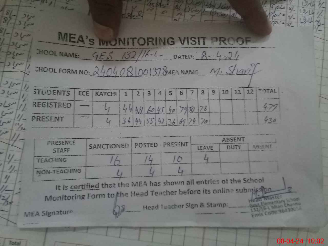 | EMIS Code: 36430058 | Name of School: GES 132/16-L, MIAN CHANNU | |||