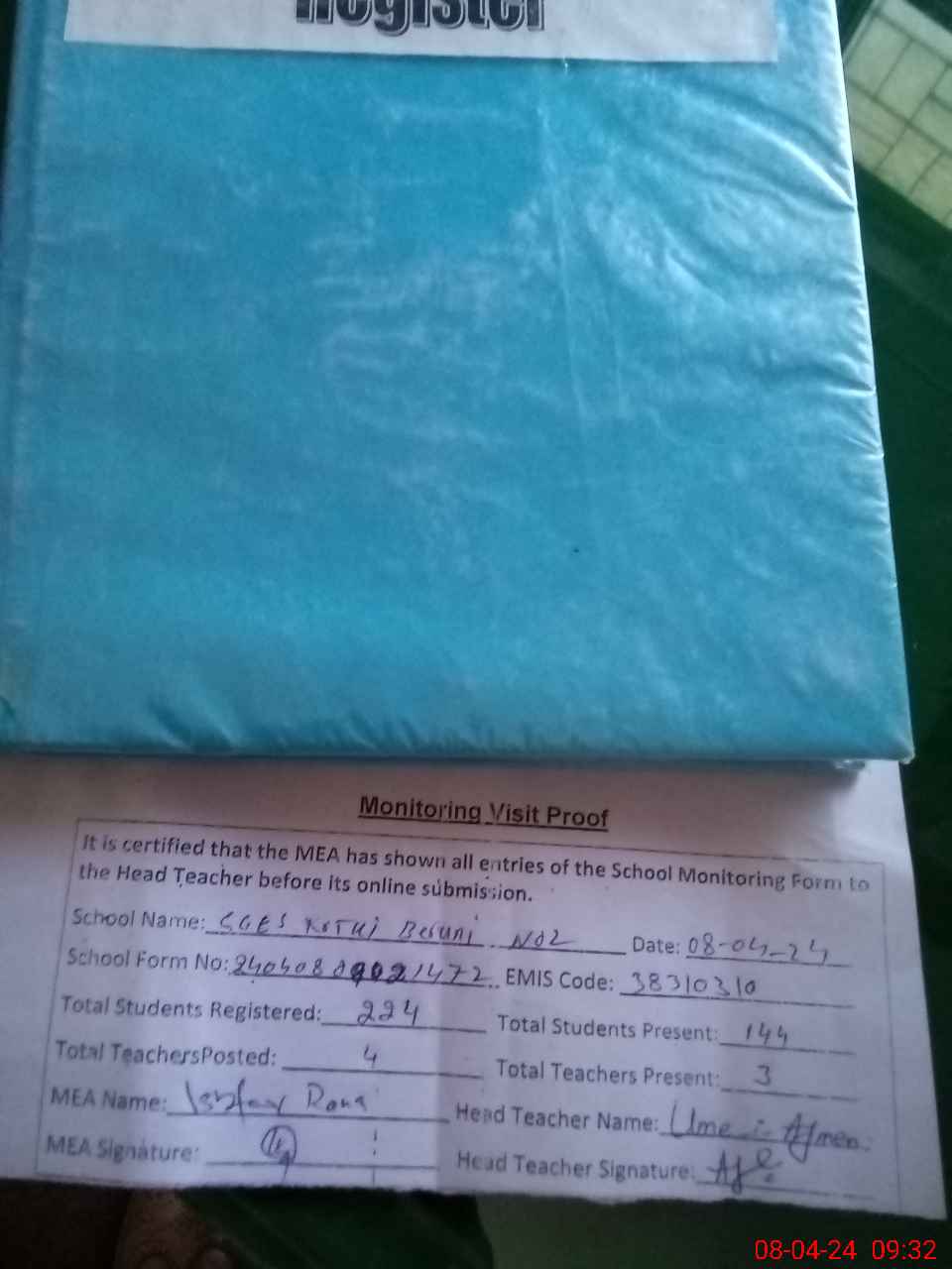 | Attendance Register | Head Teacher | MEA with School | Visit Proof |