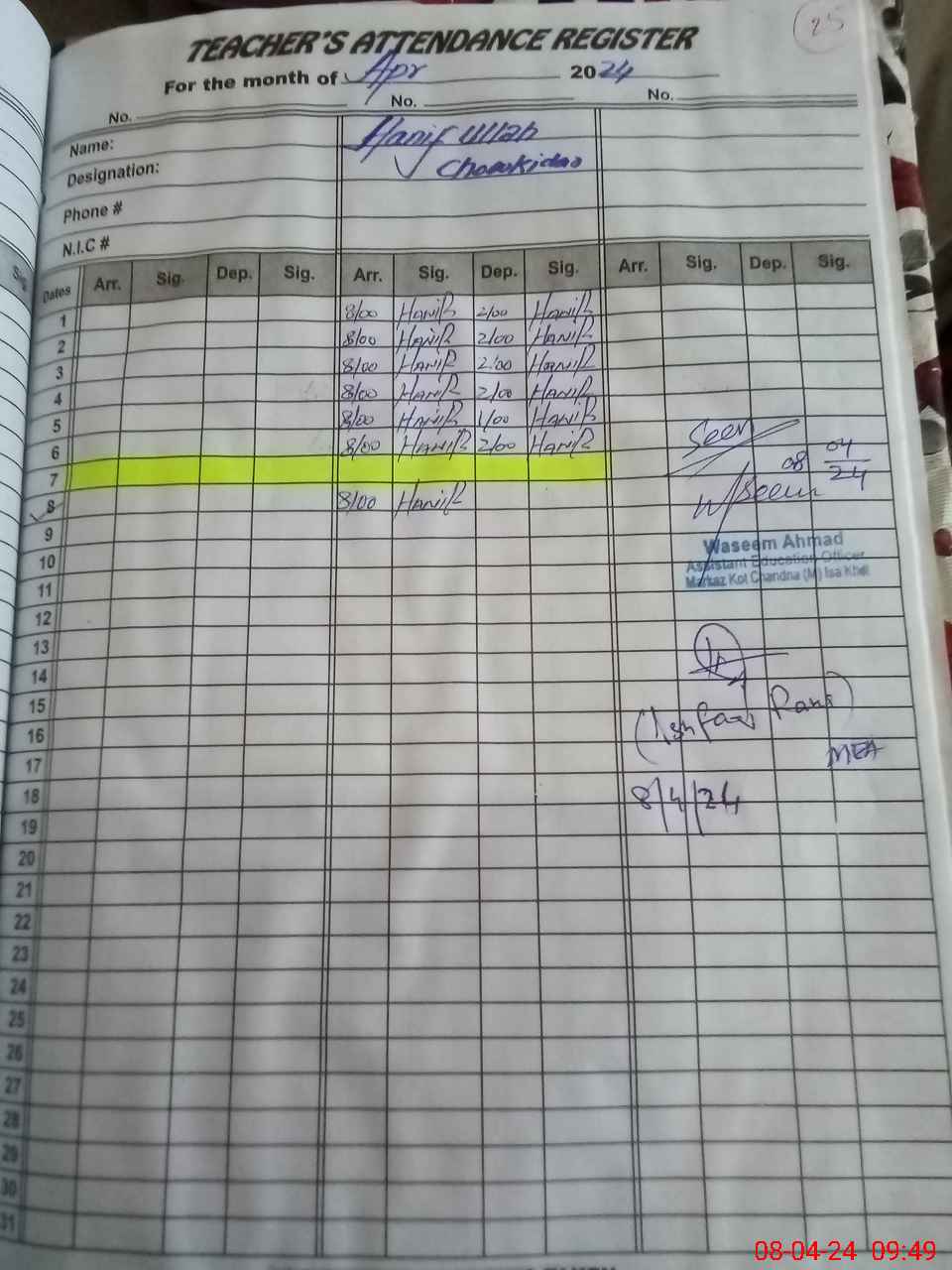 | Name: MU**** IS**** KH**** Designation: (School Headmaster's/Headmistress's) S.S.T.(GEN) Phone/Cell Number: 03**** |