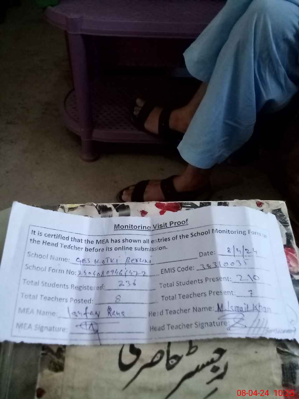 | Attendance Register | Head Teacher | MEA with School | Visit Proof |