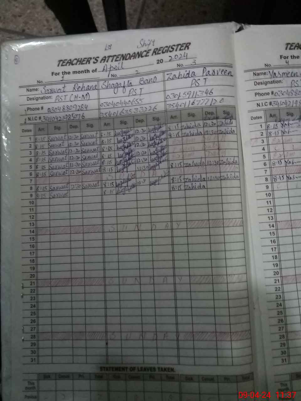 | CNIC | Full Name | Designation | R/C | Absence During Last Calender Month |