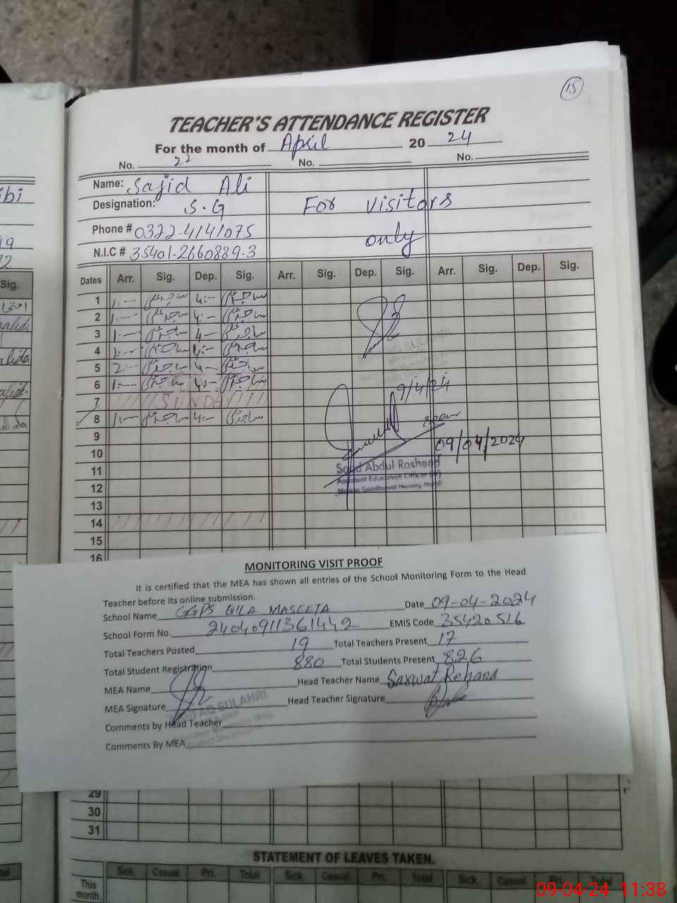| Attendance Register | Head Teacher | MEA with School | Visit Proof |