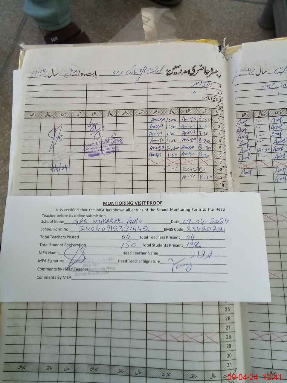 | Attendance Register | Head Teacher | MEA with School | Visit Proof |