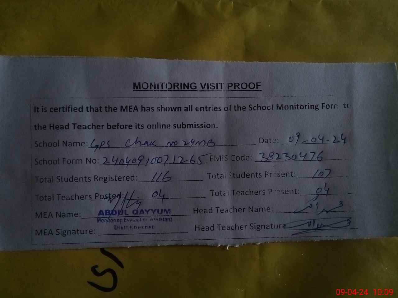 | Attendance Register | Head Teacher | MEA with School | Visit Proof |