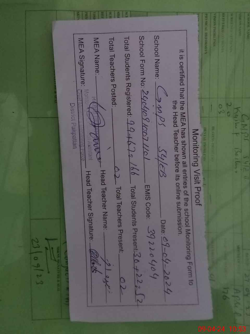 | Attendance Register | Head Teacher | MEA with School | Visit Proof |