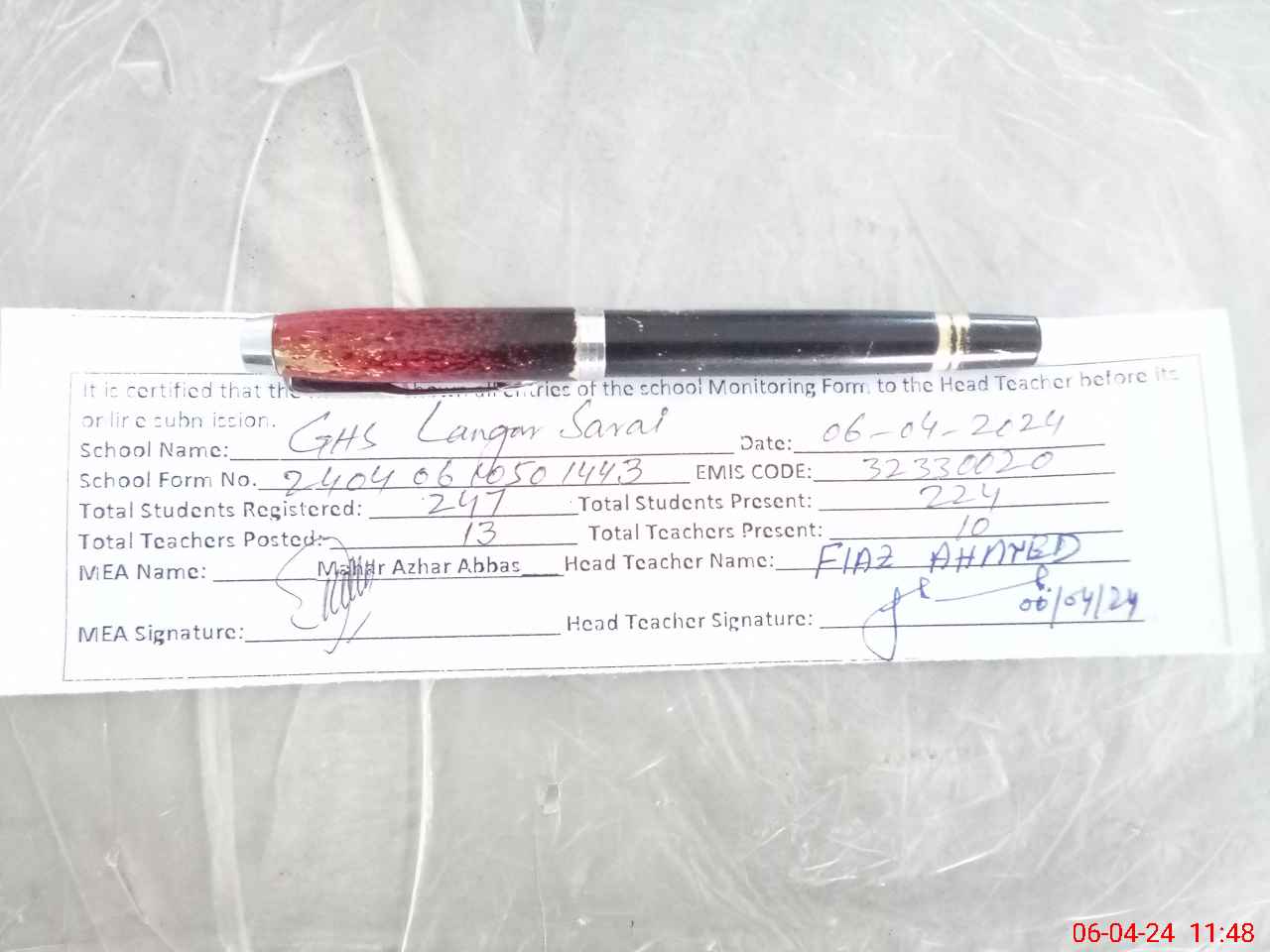 | Monitoring Date: 06-04-2024 | Start Time: 06-04-2024 10:50 AM | End Time: 06-04-2024 11:48 AM | Name of MEA: Ma**** Az**** Ab**** | |