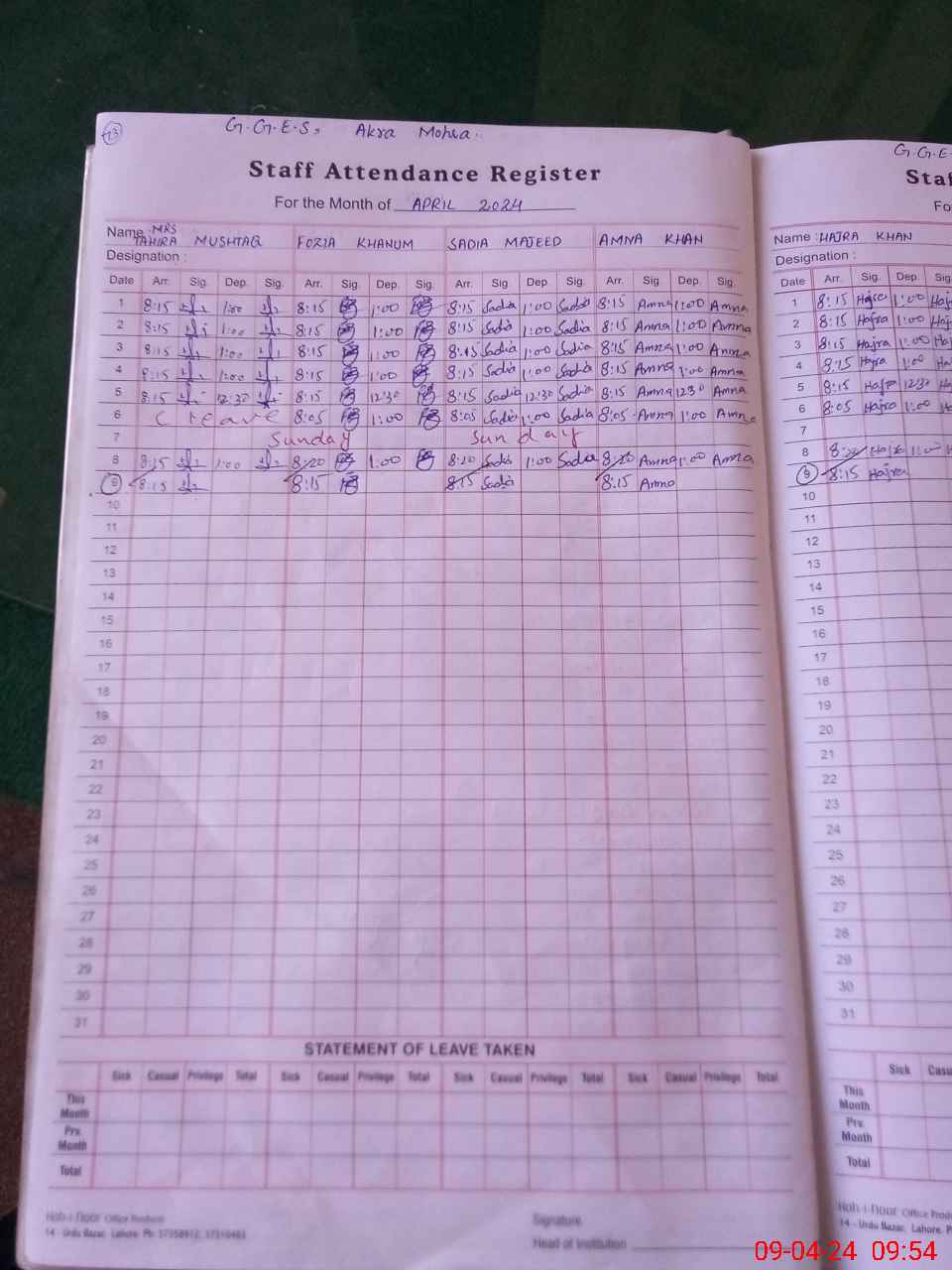 | Leave | Duty | Absent | Maternity | Medical | Ex- Pak |
