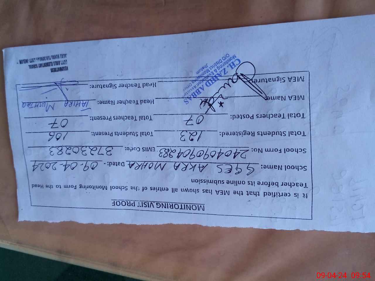 | Monitoring Date: 09-04-2024 | Start Time: 09-04-2024 09:04 AM | End Time: 09-04-2024 09:56 AM | Name of MEA: Za**** Ab**** | |