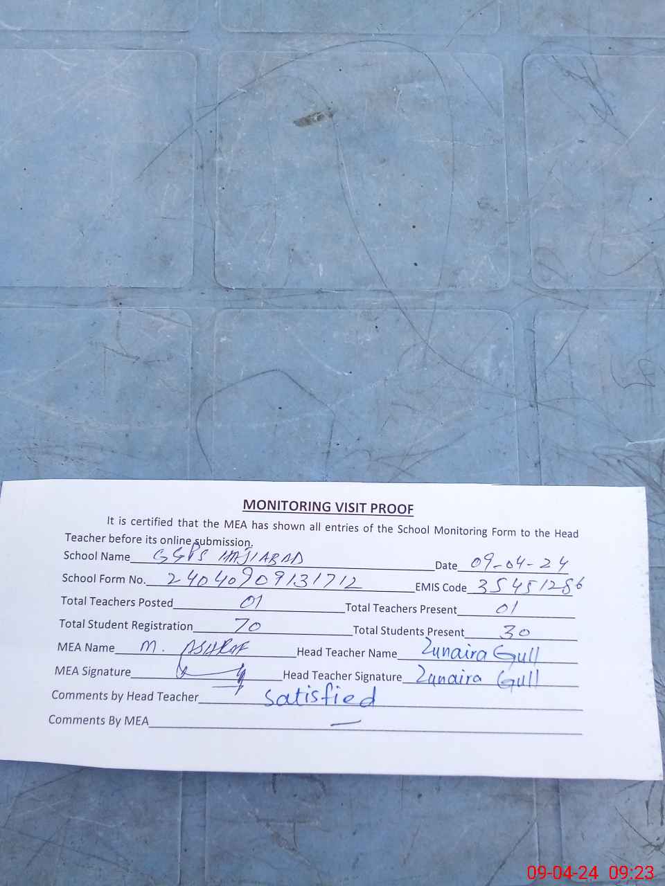 | Attendance Register | Head Teacher | MEA with School | Visit Proof |